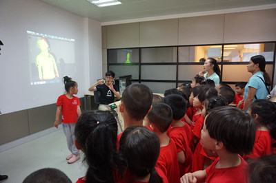 科学馆楼下。根据班级进行了分组,在人机所学生志愿者的带领下,每组小朋友分别依次参观了我所在科学馆一楼、二楼和四大发明广场等地设立的12个不同主题的展区。今年的活动主要包括沉浸式环幕电影、人脸卡通画定制、裸眼3D电视机、机顶盒手势识别游戏等内场项目和夸父二号无人车乘坐体验、越野智能车爬楼梯表演等外场项目,每个展区都有专业的讲解员为小朋友们进行生动有趣的科学知识讲解。