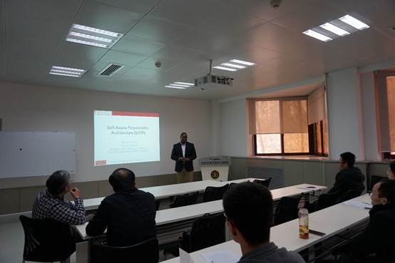 随后,来自美国波士顿大学电气与计算机工程系自适应和安全计算系统 (ASCS) 实验室主任Michel A. Kinsy助理教授做了题为“Self-Aware Polymorphic Computer Architecture”的学术报告。Kinsy博士主要研究计算机架构,互连网络,硬件级安全和网络物理系统。在报告中他详细介绍了他们提出的自我意识多形态计算机体系结构(SAPCA)系统。该系统是一个自适应计算机体系结构框架, 通过推理系统运行时性能权衡, 应用机器学习算法和控制理论技术到应用程序执行。它具有异构可重构核心,具有快速硬件级迁移能力,自组织内存结构和层次结构,自适应应用感知的片上网络和内置硬件层,用于动态自主资源管理。在讨论环节,同学们纷纷表示了对这种自我意识多形态计算机体系结构系统的向往,但是如何使SAPCA系统能够一直满足不断变化发展的计算机功能需求也提出了自己的担心。