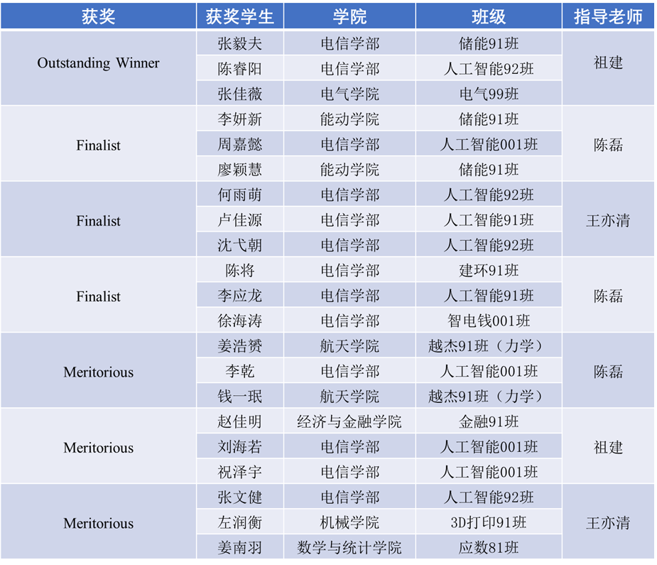 其中来自人工智能92班的陈睿阳同学所在队伍获得大赛Outstanding Winner奖(最高奖);人工智能001周嘉懿,人工智能92何雨萌、人工智能91卢佳源、人工智能92沈弋朝,人工智能91李应龙等同学所在队伍获得大赛Finalist奖(次高奖),Finalist中有一支队伍完全来自人工智能试验班;人工智能002李乾、人工智能001刘海若、人工智能001班祝泽宇、人工智能92班张文健等同学所在队伍获得Meritorious Winner奖。
