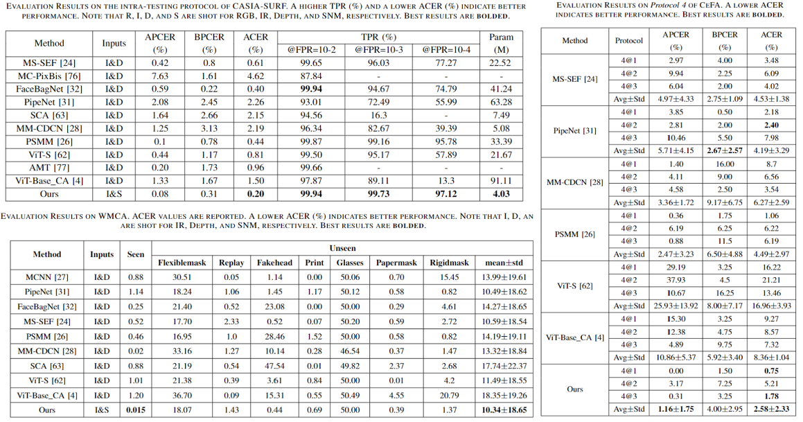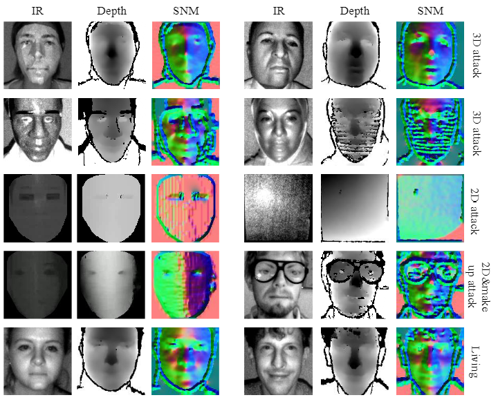 图1、来自不同公共数据库的活体和欺骗性攻击展示,其中包括红外图像、深度图和本文提出的表面法线图(SNM),SNM更具判别性的特征