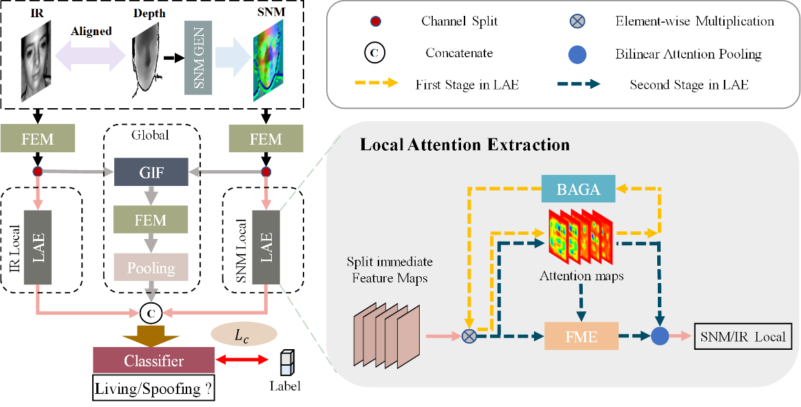 )葛晨阳博士团队提出了一种基于3D深度相机的注意力感知双流网络,同时考虑细粒度和全局融合信息。为获得具有鉴别力和稳健的人脸内部结构细节,创新地设计了一个表面法线生成器,能够适用于大多数公共多模态数据库。再将表面法线图(Surface normal map,SNM)和IR图像视为网络输入。双流网络使用注意机制将每个流分成局部和全局分支。一方面,全局分支由全局交互融合(Global Interaction Fusion,GIF)模块组成,旨在探索来自不同输入的互补性表征。另一方面,局部分支引入了一个局部注意力提取(Local Attention Extraction,LAE)模块,以关注来自每个输入中间特征图的细微区域。