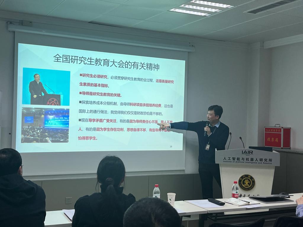 随后,薛周利部长结合具体案例,围绕“精心呵护研究生健康成长,着力促进人才自主培养质量提升”这一主题与青年教师进行了深入探讨。他强调了立德树人的根本任务,并以构建和谐的导学关系为切入点,讨论了如何提高研究生的自主培养质量。薛老师深入分析了研究生心理和特点,强调导师在研究生培养中的首要责任,要求教师们以德立身、以德立学、以德施教,成为研究生成长成才的指导者和引路人。同时,薛部长强调了研工部是各位教师工作中的坚强后盾,并承诺将与教师们共同致力于新时代研究生思政工作,加强研究生心理健康教育,为困难研究生提供帮助。