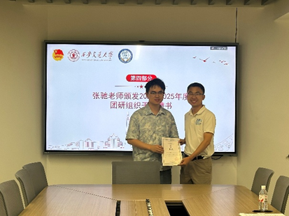 紧接着,大会进行了2024–2025年度学生干部的表彰。张驰老师为2024–2025年度团研组织干部补发聘书,李杰老师为获得“团研组织个人先进”称号的同学颁发奖状,潘运亮老师则为团研组织干部们颁发奖品。整个环节庄重而温馨,既是荣誉的见证,也是责任的传递。
