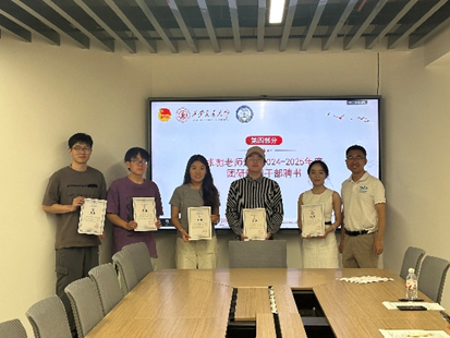 于2025年9月8日在曲江校区西一楼四楼407召开了团研组织换届答辩暨先进表彰大会。学院党委副书记李杰老师、学院团委书记张驰副教授、学院辅导员潘运亮老师,以及学院团委学生副书记伍虹颖、席媛媛出席会议。本次大会由伍虹颖主持。