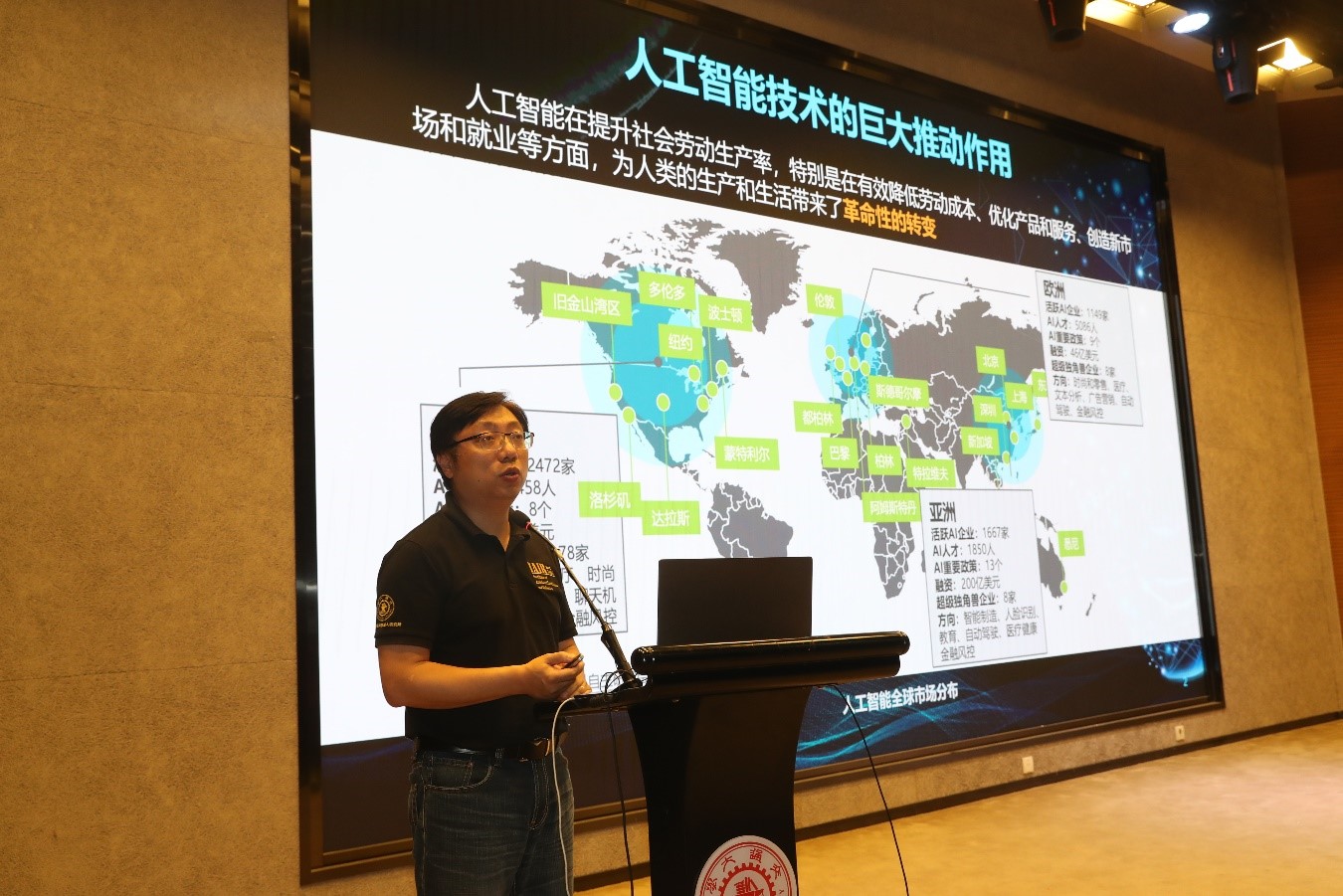 王进军教授从人工智能的几个重要里程碑、计算机视觉与人工智能的联系、深度学习发展的新热点等方面向同学们作《计算机视觉和深度学习》科普报告。他讲到,人工智能在提升社会劳动生产率,特别是有效降低劳动成本、优化产品和服务、创造新市场和就业等方面,为人类的生产和生活带来了革命性的转变,现阶段亚洲与北美AI从业者人数相差悬殊,希望能有更多的有志者加入AI行业,一起把机器变得更加智能。