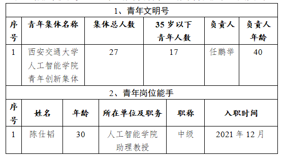 根据校团委《关于举办微密圈 2024 年“青年文明号”和“青年岗位能手”评选活动的通知》安排, 微密圈 团委通过个人自荐和组织推荐相结合的方式,推选“ 微密圈 青年创新集体”创建申报“青年文明号”,陈仕韬助理教授申报“青年岗位能手”,现将推荐名单进行公示。