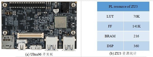 该竞赛分别提供了NVIDIA TX2和Xilinx Ultra96的设计平台两个赛道。我们团队参加了FPGA赛道,在官方提供的搭载了Xilinx UltraScale+ ZU3的Ultra96平台上进行开发。Ultra96是一款优秀的Xilinx ZYNQ的开发板,针对低功耗IoT环境而设计。其PS侧搭载四核ARM Cortex-A53 CPU,主频为1.5GHz;软件方面可以使用基于Python的PYNQ框架进行开发。Ultra96平台以及ZU3的PL侧资源如下图所示。
